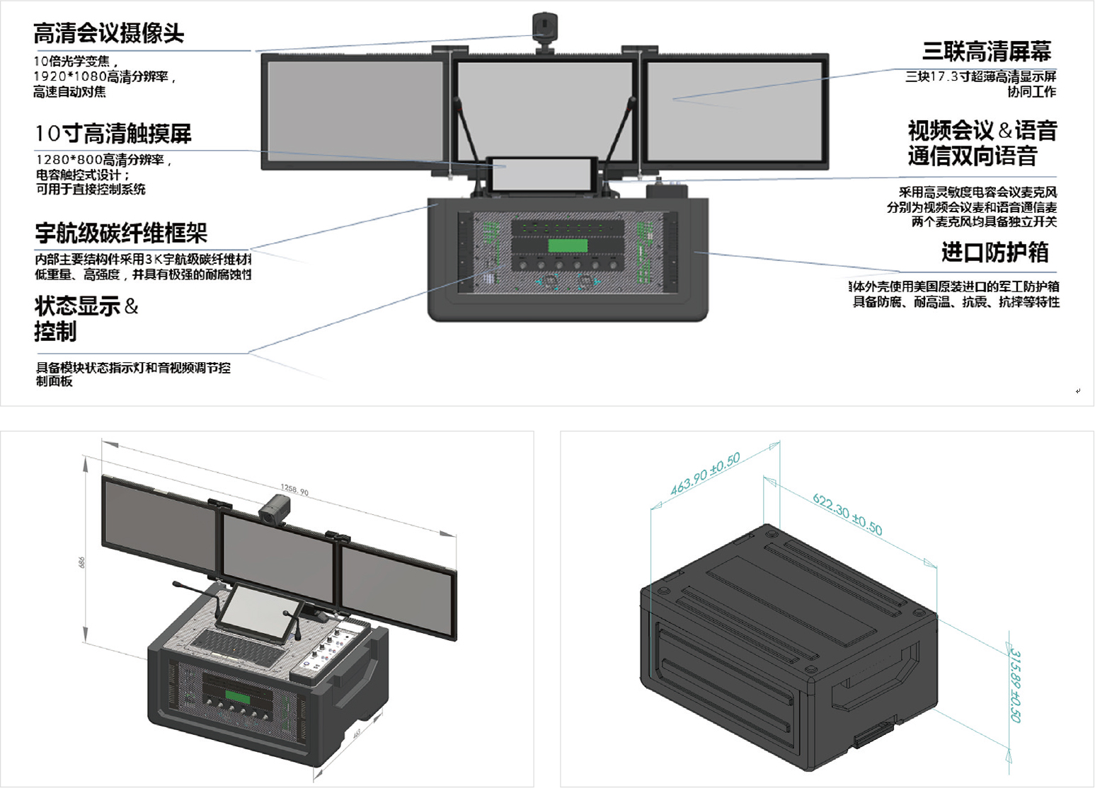 ◆ 四屏協(xié)同顯控:設(shè)備自身具備四塊屏幕,其中三屏采用翻折式設(shè)計(單屏尺寸為17.3寸),一屏觸控(10.1寸),四屏聯(lián)動使用;